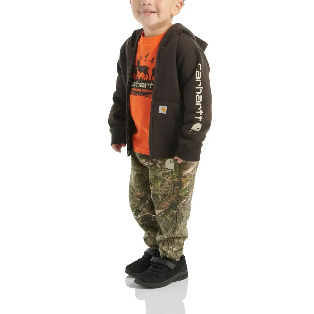 Long before he bags his first buck, this three-piece T-shirt, jacket, and pants set lets baby boys look the part. It includes a cotton long-sleeve top done in bright safety orange, fleece jogger pants featuring Mossy Oak® Country DNA camo, and a full-zip fleece hoodie. All pieces are machine washable and built tough for outdoorsy boys.
