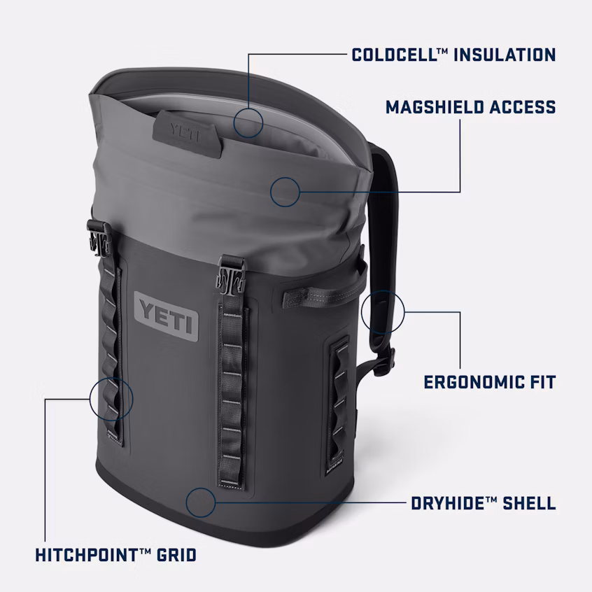 The Hopper® M20 Soft Backpack Cooler allows you to put the day on your back - literally. This hands-free cooler bag comfortably straps on like a backpack to keep you mobile, while a strip of ultra-strong magnets keeps the cold locked in. The new MagShield Access opens wide so you can easily load in beer, ice, or your favorite sandwiches. Attach accessories such as the Rambler® Bottle Sling or Sidekick Dry® Gear Case to the HitchPoint™ Grid to keep useful gear at your fingertips. The Hopper® M20 is the cooler that goes where other coolers can’t.