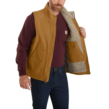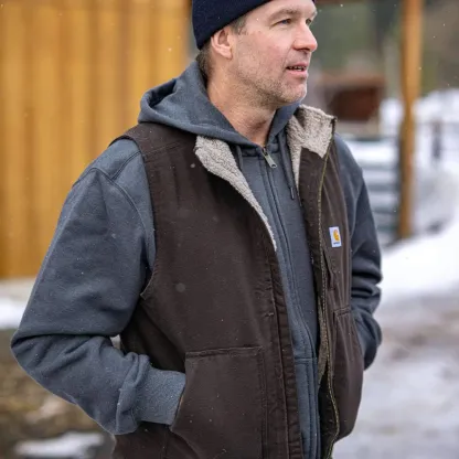 Layer up and head out into the field comfortably on cool days in this sherpa-lined vest. Featuring a rugged cotton duck exterior for durability, the sherpa lining provides additional warmth. A zip pocket on the chest and two inside pockets provide storage for the tools of your trade.